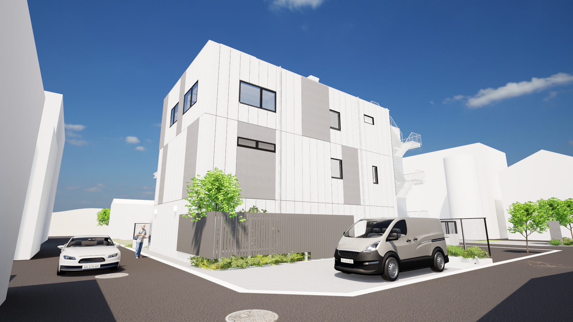 隣地に建つ旧オフィスとの調和を考え、外観の色彩やボリュームの検討をしました。